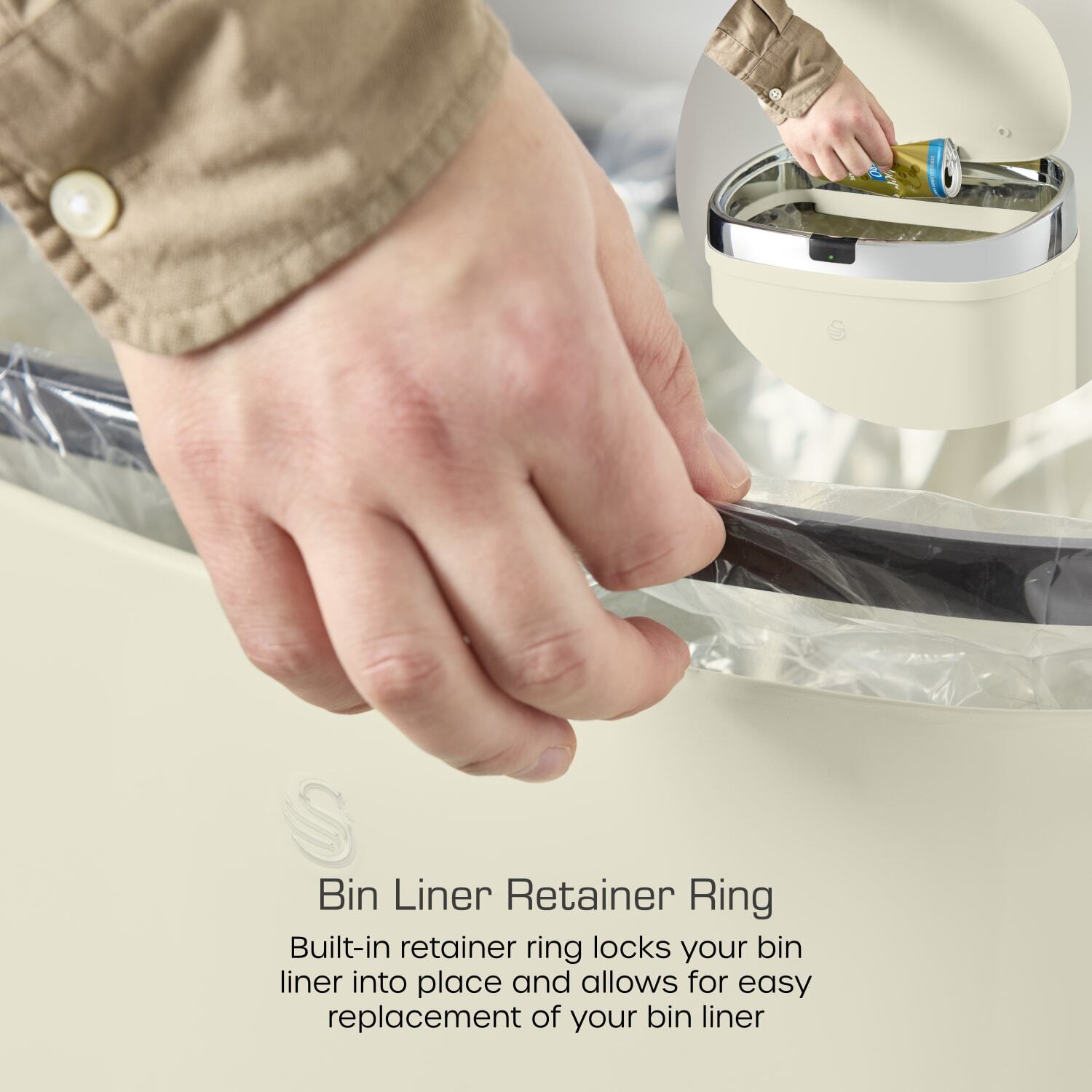 • Bin liner retainer ring – Built in retainer ring locks your bin liner into place and allows for easy replacement