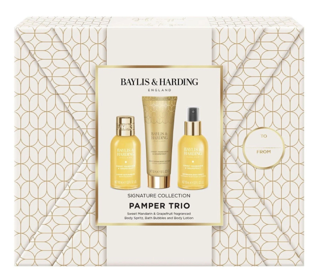 Beautifully wrapped and ready to pop under the tree, indulge in all your pamper essentials. Contains 100ml bath bubbles, 95ml body spritz and 50ml body lotion. Baylis & Harding's iconic Sweet Mandarin & Grapefruit fragrance.