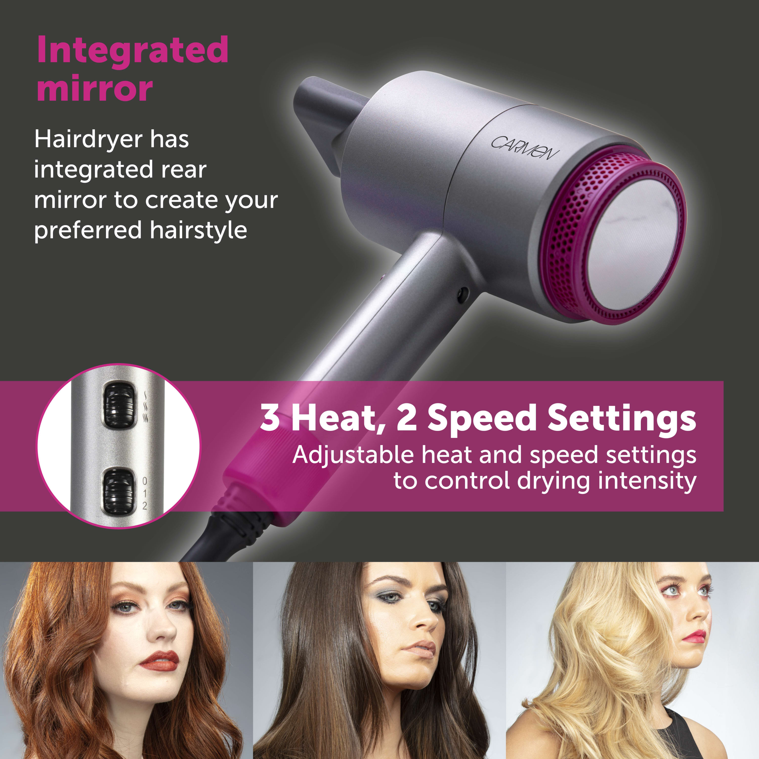 • 3 heat, 2 speed settings – Adjustable heat and speed settings to control drying intensity.