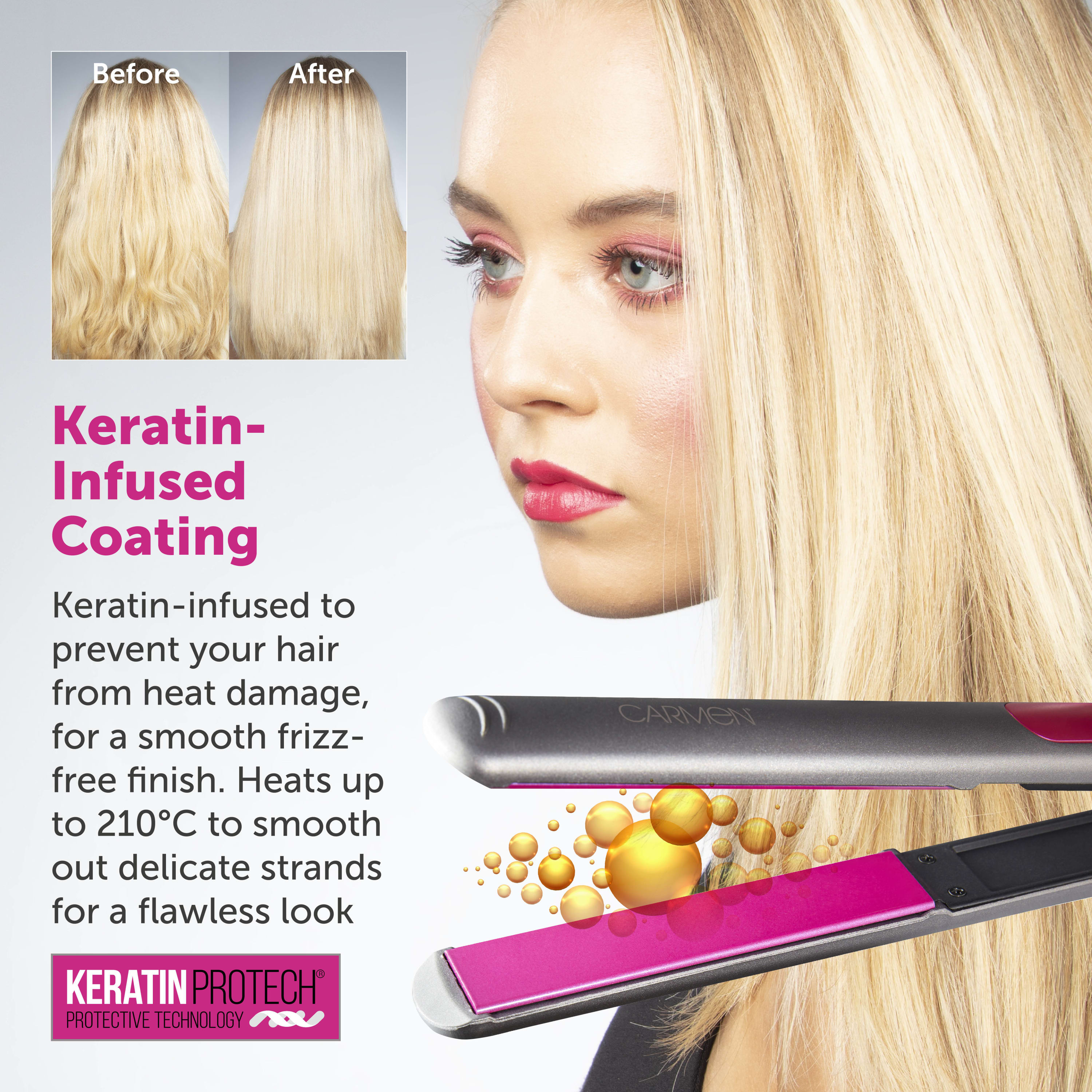 • Kerin infused coating – To prevent your hair from getting heat damage, for a smooth frizz free finish. Heats up to 210°C to smooth out delicate strands for flawless look.