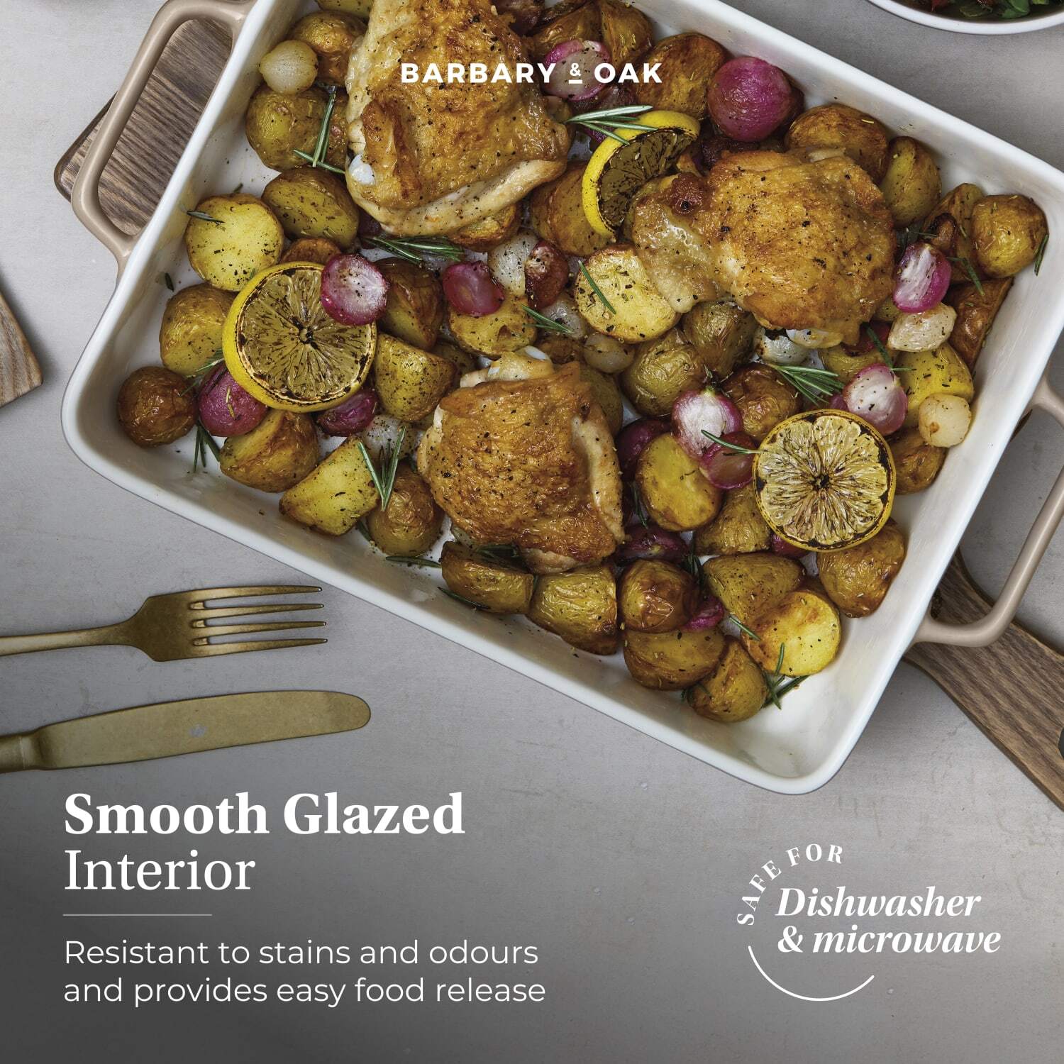 • Smooth glazed interior – resistant to stains and odours and provides food release