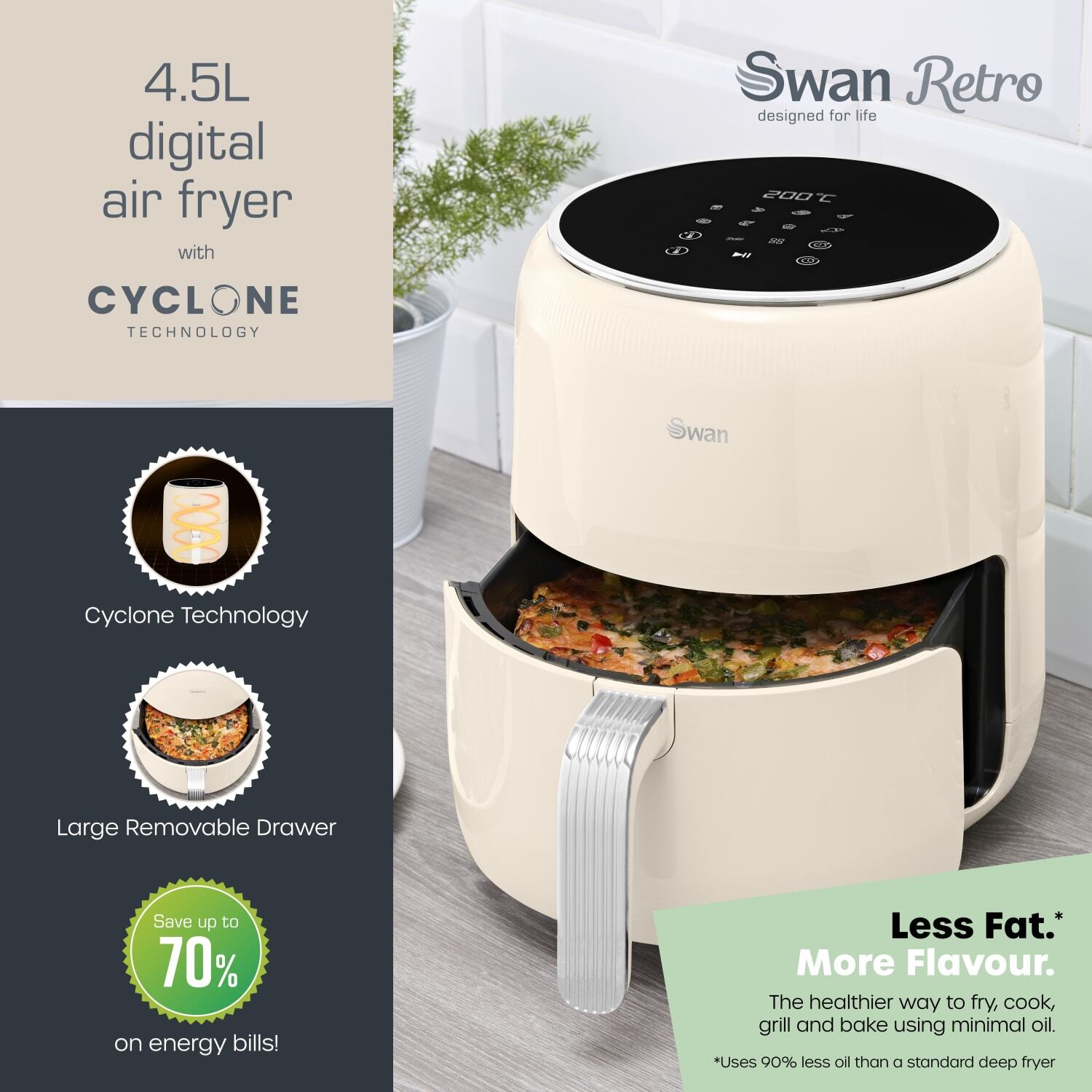 Less fat, more flavour.The healthier way to fry, cook, grill and bake using minimal oil. (Uses 90% less than a standard deep fryer).Energy efficient swan...