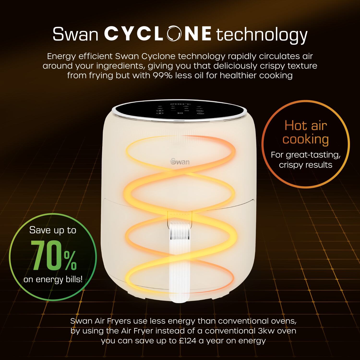 Energy efficient swan cyclone technology rapidly circulates air around your ingredients, giving you that deliciously crispy texture from frying but with 99% less oil for healthy cooking. Use less energy than conventional ovens, by using the air fryer instead of a conventional 3kw oven, you can save up to £124 a year.