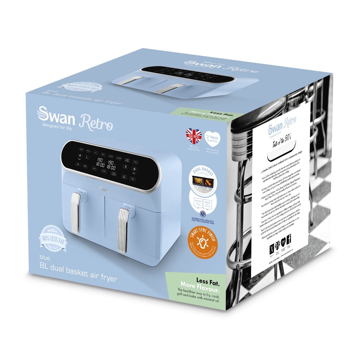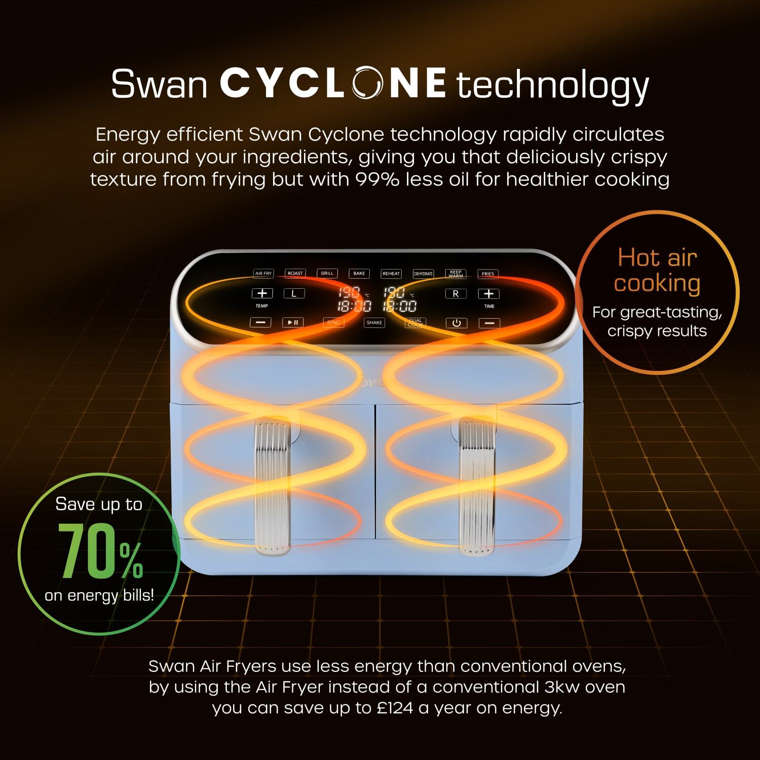 Energy efficient swan cyclone technology rapidly circulates air around your ingredients, giving you that deliciously crispy texture from frying but with 99% less oil for healthy cooking. Use less energy than conventional ovens, by using the air fryer instead of a conventional 3kw oven, you can save up to £124 a year.