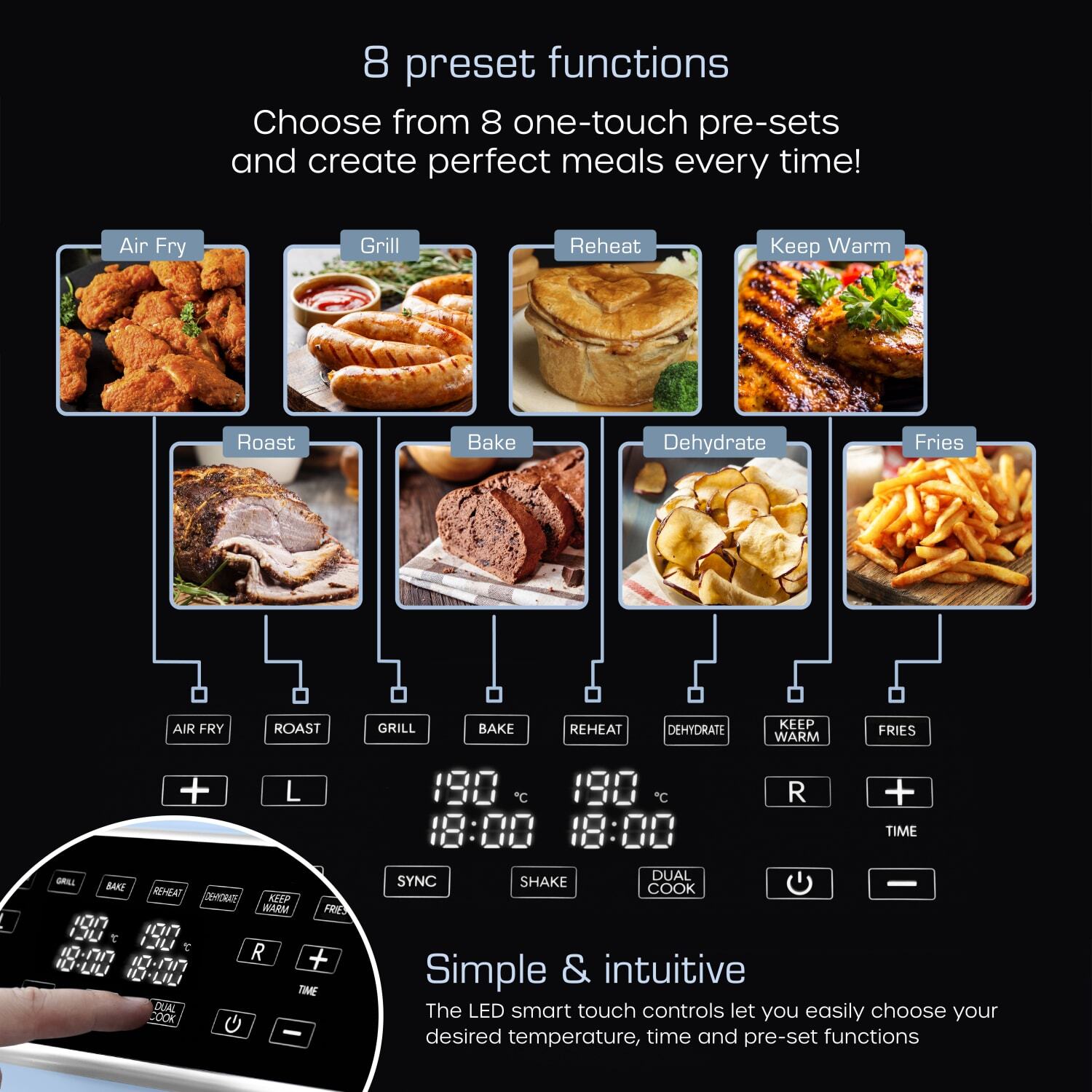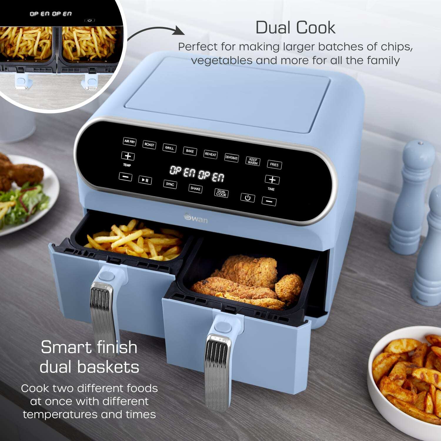 Smart finish dual baskets – cook two different foods at once with different temperatures and times.