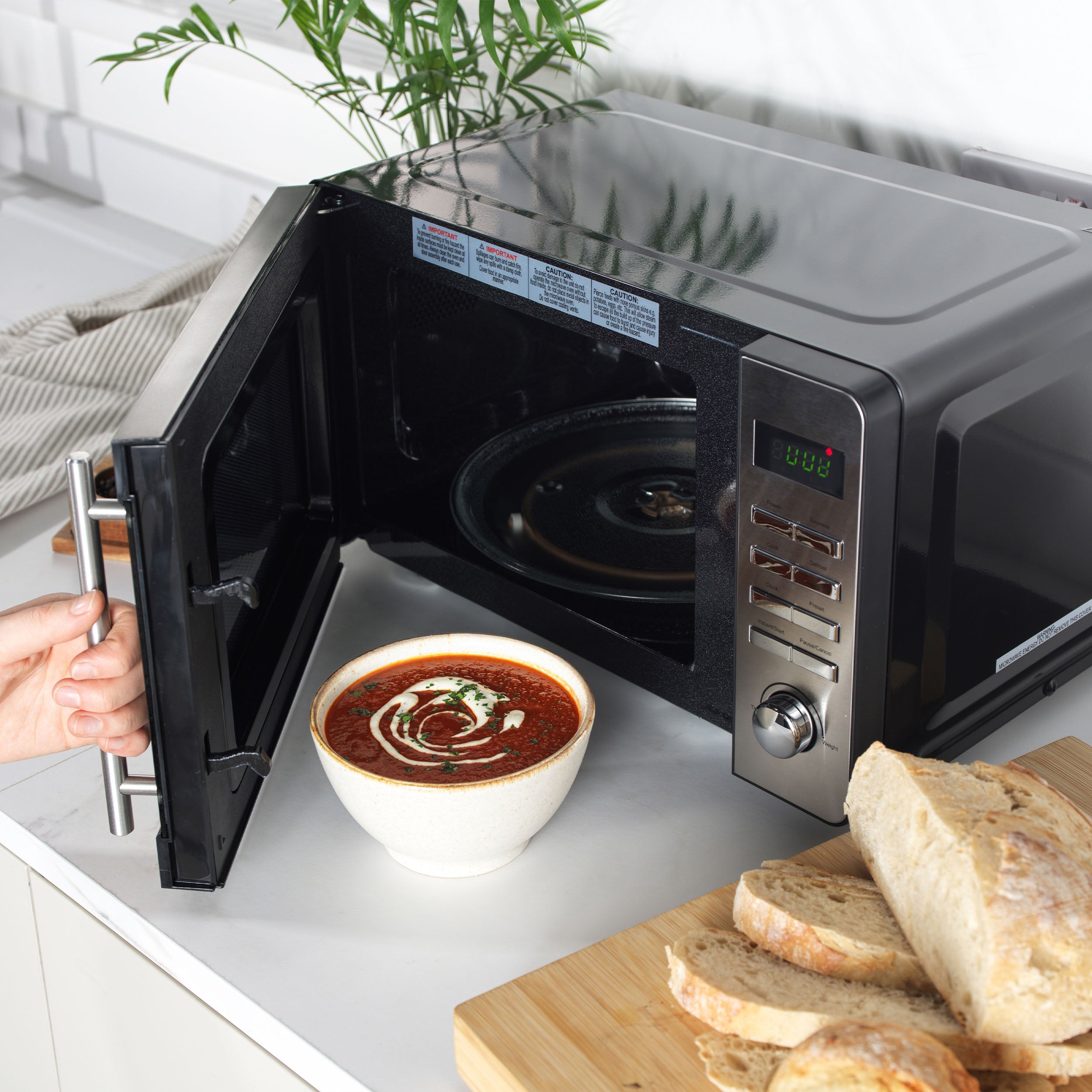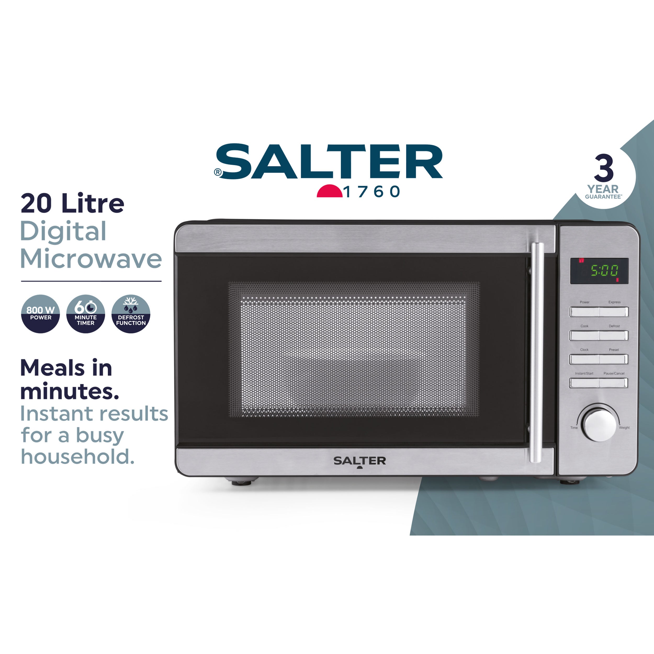 This Salter 20L Digital Microwave is a modern kitchen essential, with its sleek stainless steel finish, 800W power and 60-minute timer.. For added convenience, there is an instant start and defrost function. The large 27cm rotating turntable ensures even cooking. It is designed to fit any kitchen décor. Enjoy perfectly cooked, delicious meals for the whole family with the Salter 20L Digital Microwave.