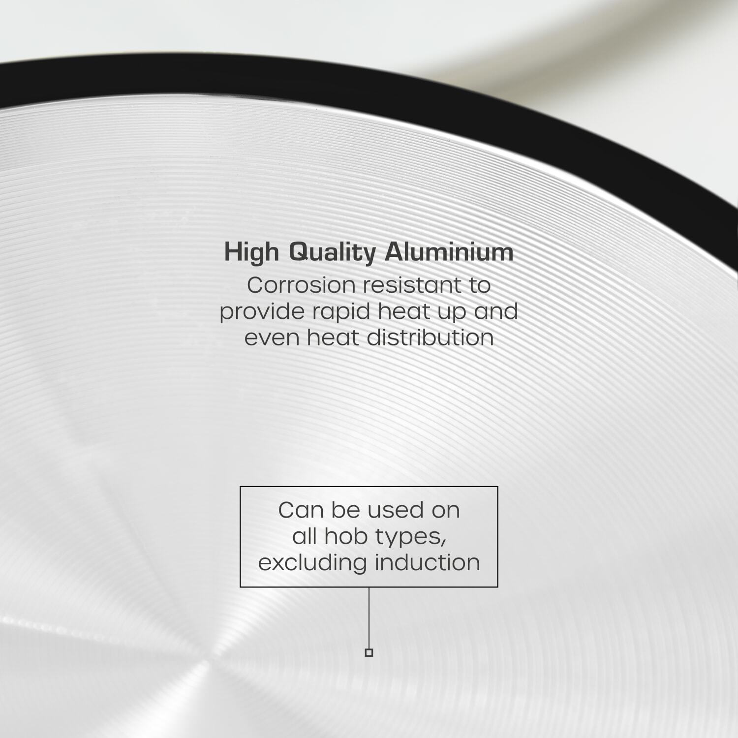 High quality aluminium – corrosion resistant to provide rapid heat up and even distribution and can be used on all hob types, excluding induction.