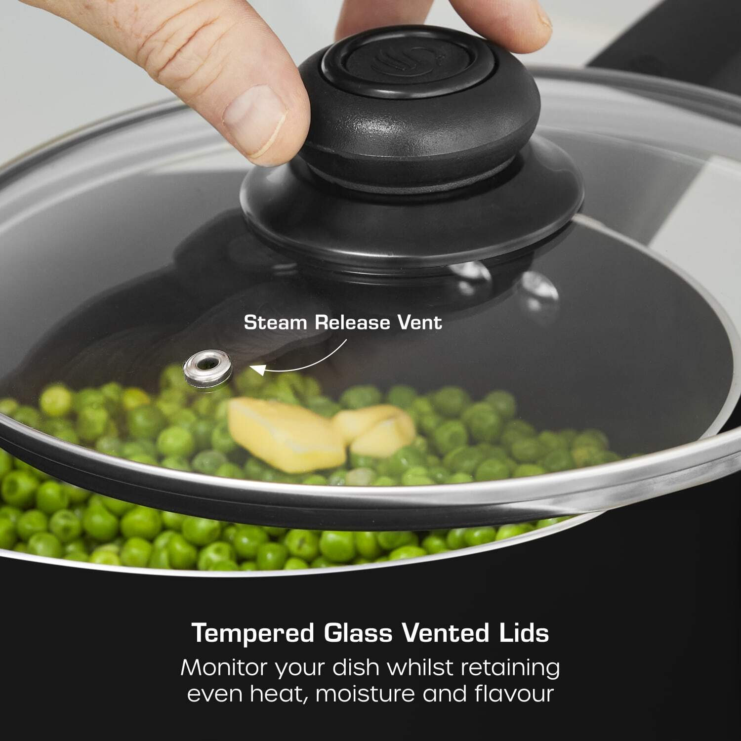 Tempered glass vented lids – monitor your dish whilst retaining even heat, moisture and flavour.