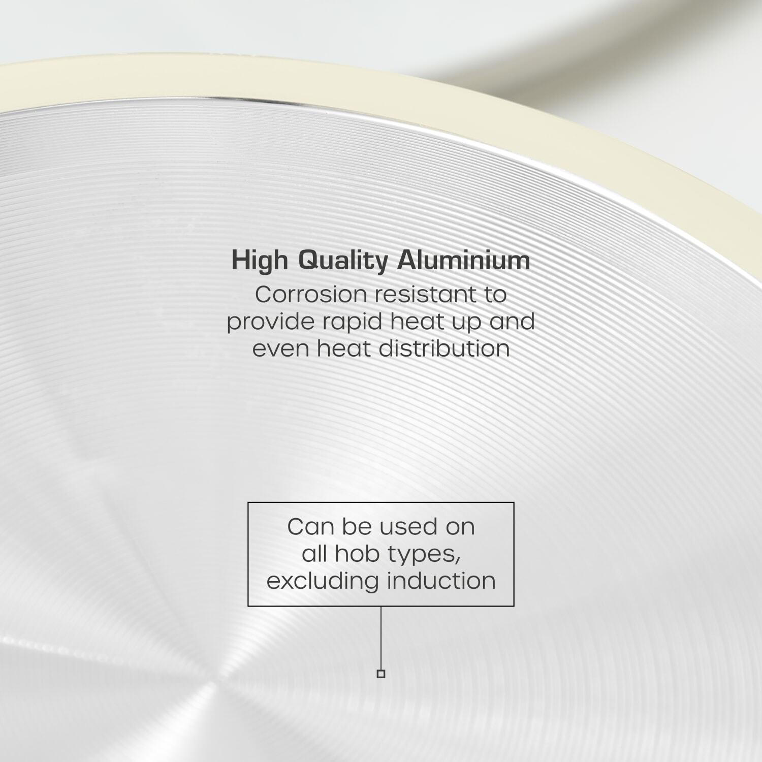 High quality aluminium – corrosion resistant to provide rapid heat up and even distribution and can be used on all hob types, excluding induction.