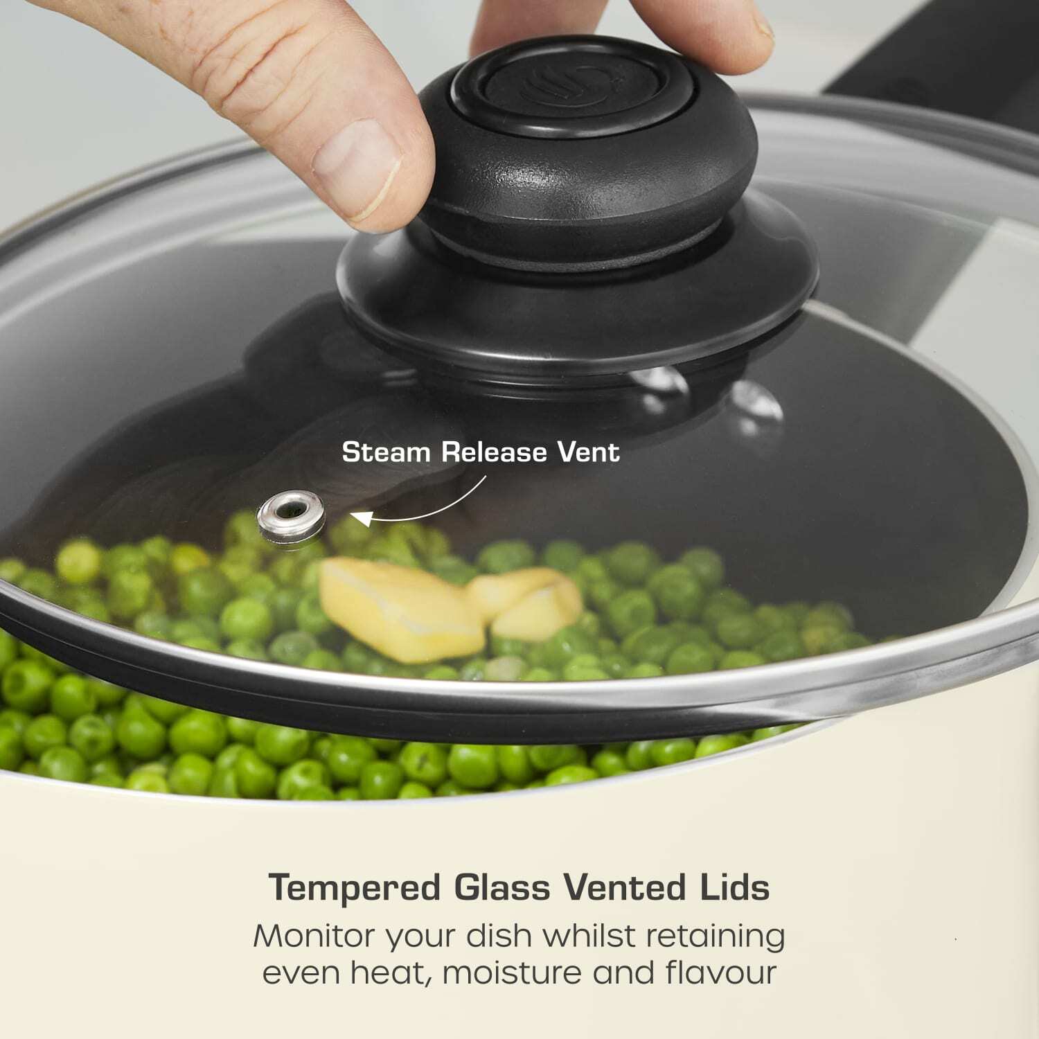 Tempered glass vented lids – monitor your dish whilst retaining even heat, moisture and flavour.
